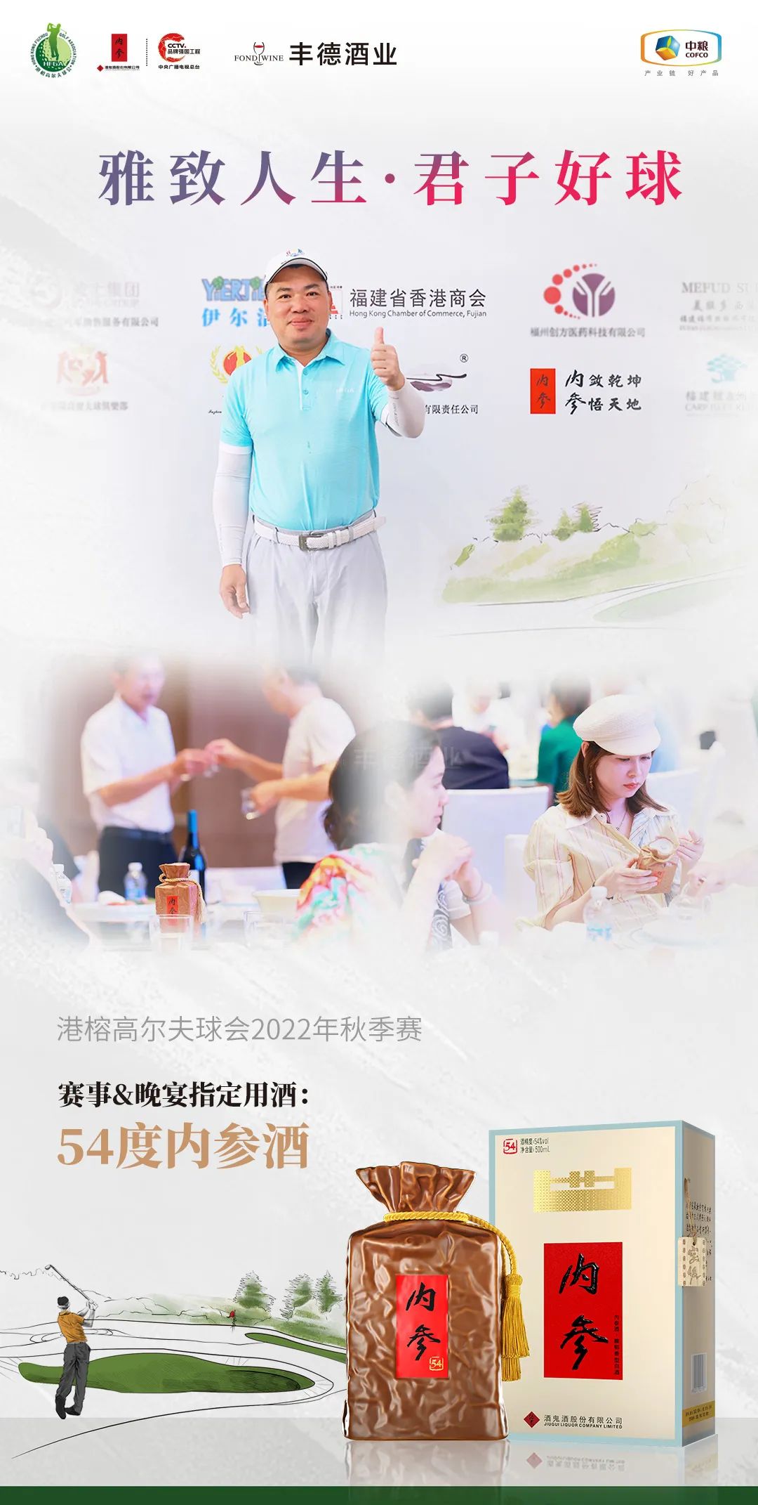9月17日,港榕高爾夫球會(huì)2022年秋季賽于福州開賽,54度內(nèi)參酒作為賽事和晚宴指定用酒全情支持本屆比賽。一杯一桿間,盡顯人生瀟灑!